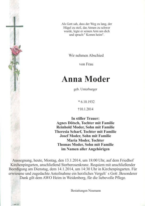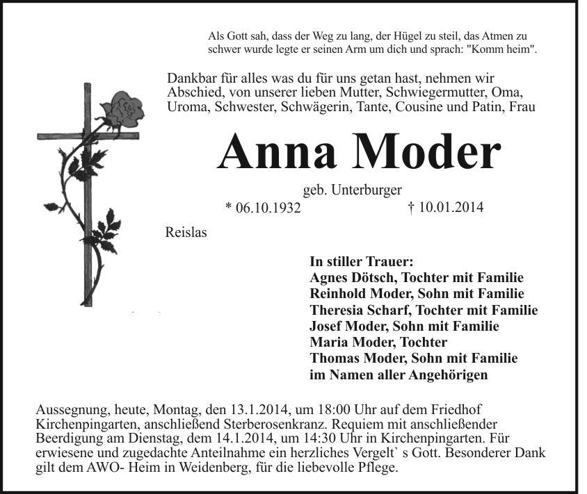 Aussegnung, heute, Montag, den 13.1.2014, um 18:00 Uhr auf dem Friedhof Kirchenpingarten, anschließend Sterberosenkranz. Requiem mit anschließender Beerdigung am Dienstag, dem 14.1.2014, um 14:30 Uhr in Kirchenpingarten. Für erwiesene und zugedachte Anteilnahme ein herzliches Vergelt` s Gott. Besonderer Dank gilt dem AWO- Heim in Weidenberg, für die liebevolle Pflege.