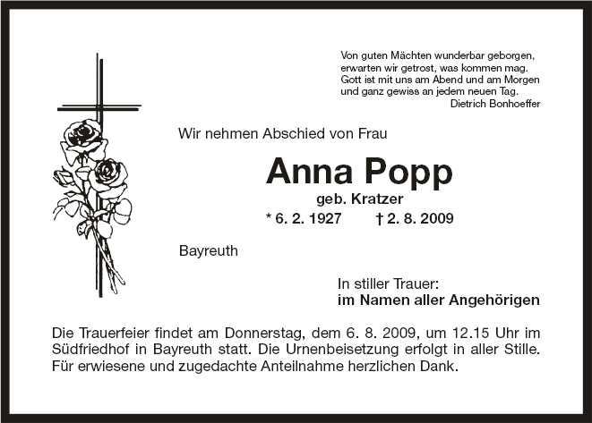 Die Trauerfeier findet am Donnerstag, dem 06.08.2009 um 12.15 Uhr auf dem Südfriedhof in Bayreuth statt.