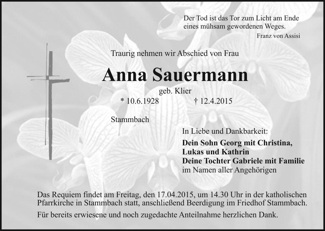 Das Requiem findet am Freitag, den 17.04.2015, um 14.30 Uhr in der katholischen Pfarrkirche in Stammbach statt, anschließend Beerdigung im Friedhof Stammbach.