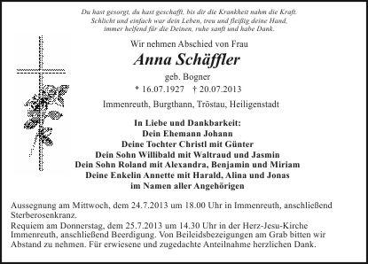 Requiem am Donnerstag, dem 25.7.2013 um 14.30 Uhr in der Herz-Jesu-Kirche Immenreuth, anschließend Beerdigung. Von Beileidsbezeigungen am Grab bitten wir Abstand zu nehmen. Für erwiesene und zugedachte Anteilnahme herzlichen Dank.