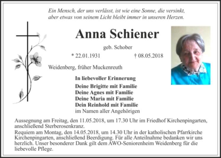 Requiem am Montag, den 14.05.2018, um 14.30 Uhr in der katholischen Pfarrkirche Kirchenpingarten, anschließend Beerdigung. Für alle Anteilnahme bedanken wir uns herzlich. Unser besonderer Dank gilt dem AWO-Seniorenheim Weidenberg für die liebevolle Pflege.