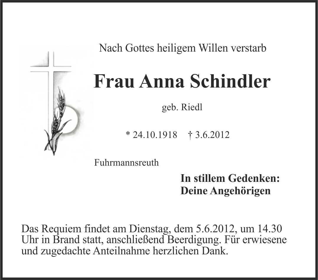 Das Requiem findet am Dienstag, dem 5.6.2012 um 14.30 Uhr in Brand statt, anschließend Beerdigung. Für erwiesene und zugedachte Anteilnahme herzlichen Dank.