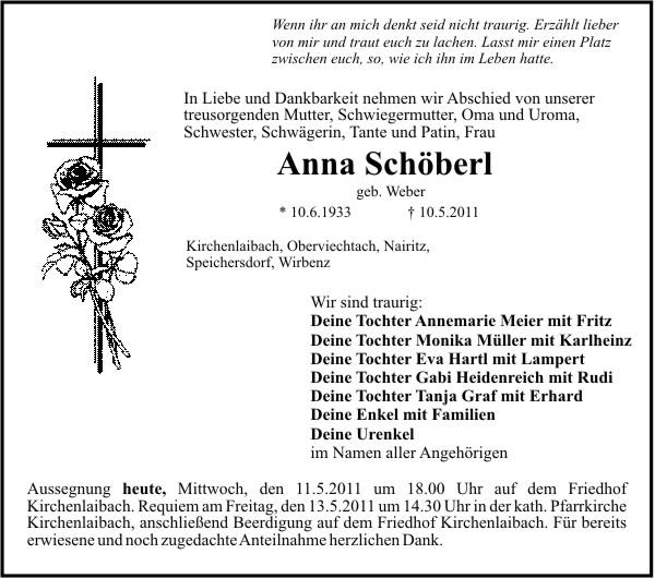 Die Beisetzung findet am Freitag, 13.05.2011 um 14:30 Uhr auf dem Friedhof in Kirchenlaibach statt.