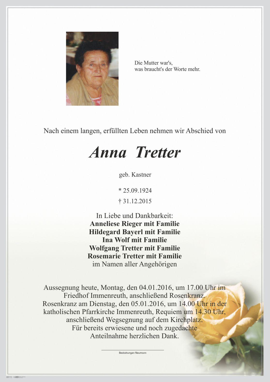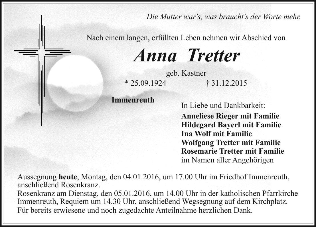 Aussegnung heute, Montag, den 04.01.2016, um 17.00 Uhr im Friedhof Immenreuth, anschließend Rosenkranz.