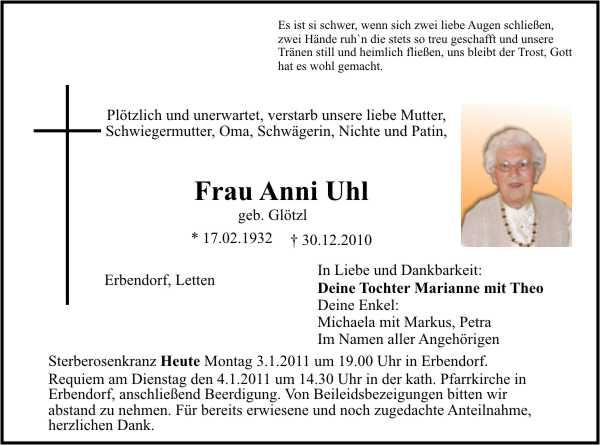 Requiem am Dienstag, den 4.1.2011 um 14.30 Uhr in der kath. Pfarrkirche in Erbendorf, anschließend Beerdigung. Von Beileidsbezeigungen bitten wir Abstand zu nehmen. Für bereits erwiesene und noch zugedachte Anteilnahme, herzlichen Dank.