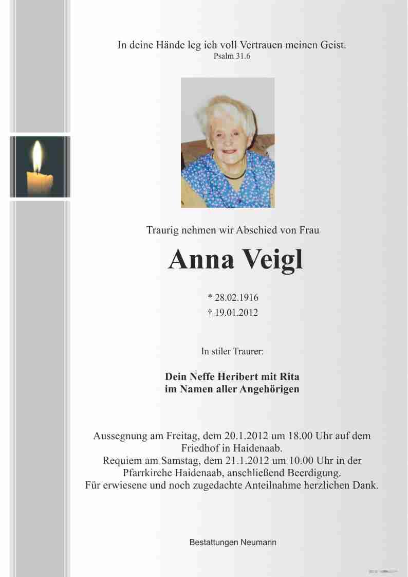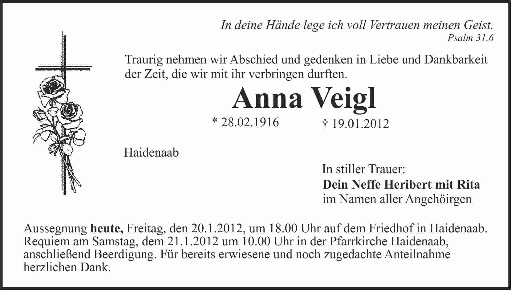 Aussegnung am, Freitag, dem 20.1.2012, um 18.00 Uhr auf dem Friedhof in Haidenaab. Requiem am Samtstag, dem 21.1.2012 um 10.00 Uhr in der Pfarrkirche Haidenaab, anschließend Beerdigung. Für bereits erwiesene und noch zugedachte Anteilnahme herzlichen Dank.