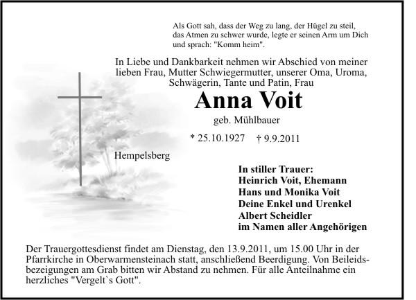 Die Beisetzung findet am Dienstag, 13.09.2011 um 15:00 Uhr auf dem Friedhof in Oberwarmensteinach statt.