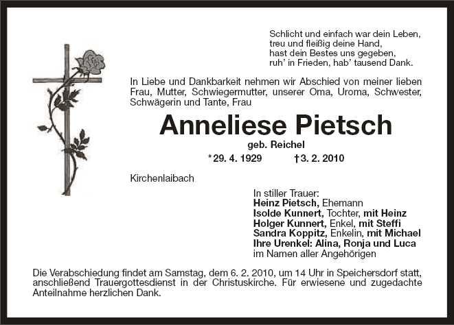 Verabschiedung am Samstag, den 6.Februar 2010, um 14.00 Uhr in Speichersdorf, anschließend Trauergottesdienst in der Christuskirche.