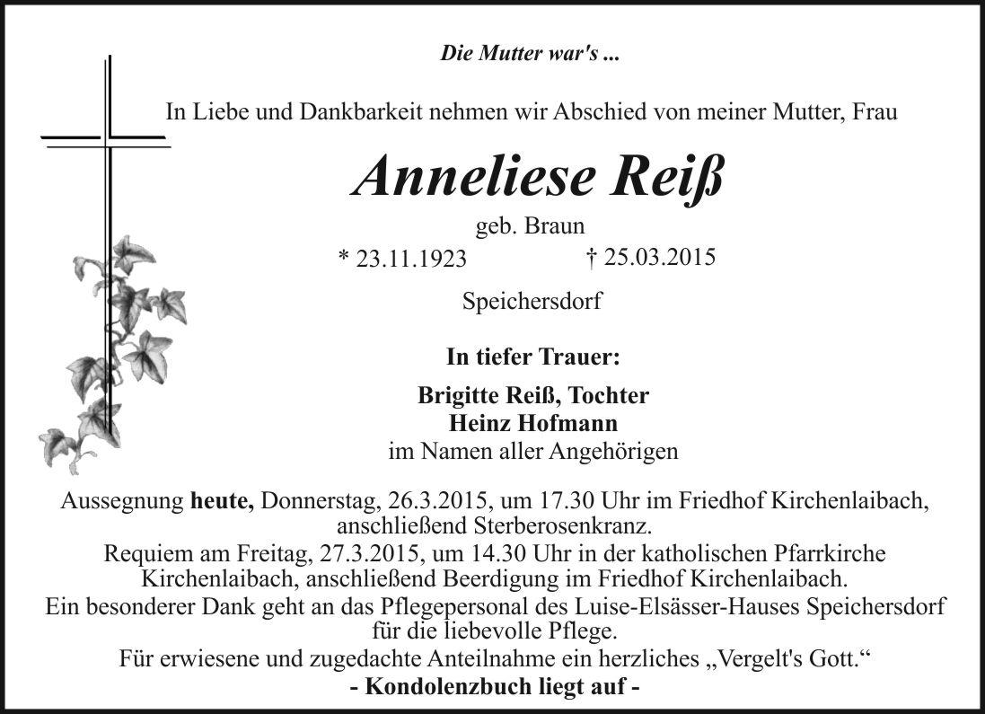 Requiem am Freitag, 27.3.2015, um 14.30 Uhr in der katholischen Pfarrkirche Kirchenlaibach, anschließend Beerdigung im Friedhof Kirchenlaibach.