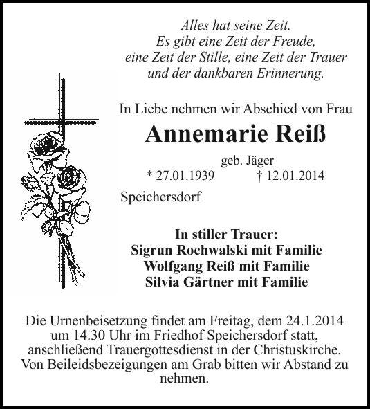 Die Urnenbeisetzung findet am Freitag, dem 24.1.2014 um 14.30 Uhr im Friedhof Speichersdorf statt, anschließend Trauergottesdienst in der Christuskirche. Von Beileidsbezeigungen am Grab bitten wir Abstand zu nehmen.
