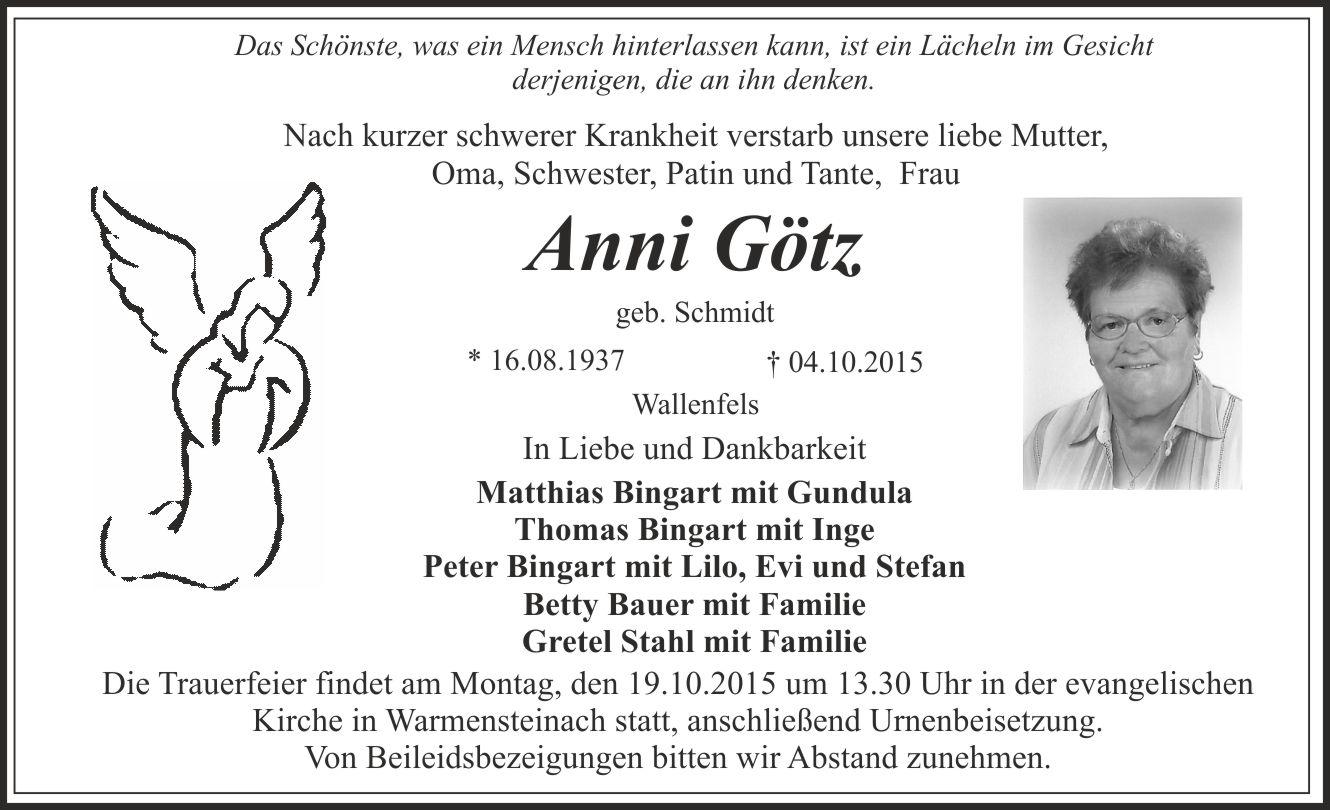 Die Trauerfeier findet am Montag, den 19.10.2015, um 13.30 Uhr in der evangelischen Kirche in Warmensteinach statt, anschließend Urnenbeisetzung. Von Beileidsbezeigungen bitten wir Abstand zu nehmen. Für alle Anteilnahme herzlichen Dank.