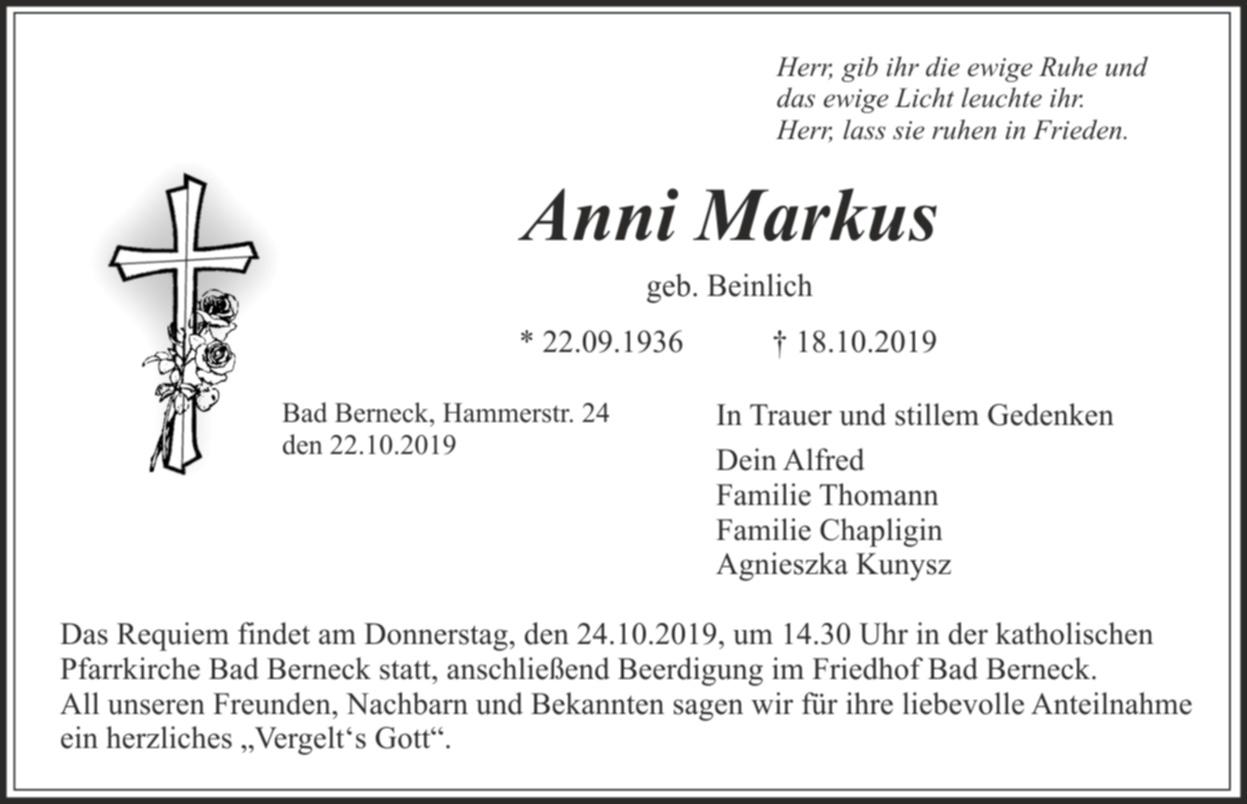 Das Requiem findet am Donnerstag, den 24.10.2019, um 14.30 Uhr in der katholischen Pfarrkirche Bad Berneck statt, anschließend Beerdigung im Friedhof Bad Berneck.