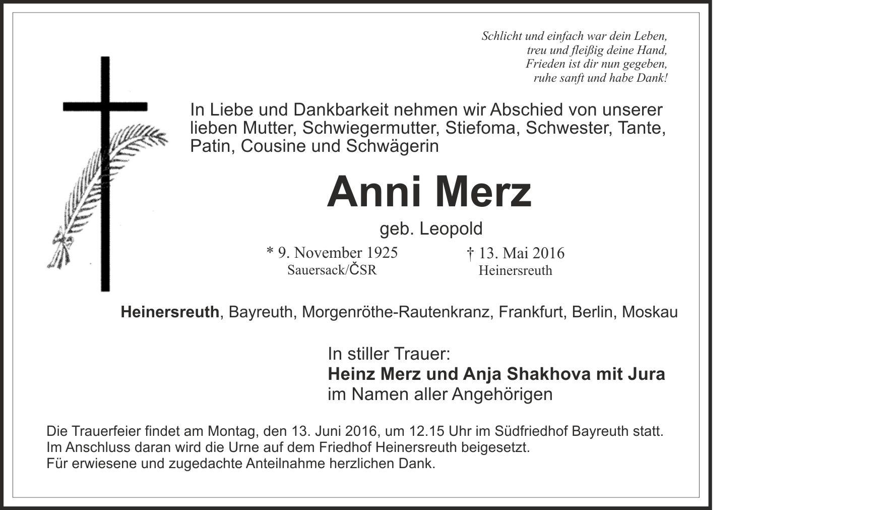 Der Trauergottesdienst findet am Montag, den 13.06.2016, um 12.15 Uhr im Südfriedhof Bayreuth statt, anschließend wird die Urne im Friedhof Heinersreuth beigesetzt. Für alle Anteilnahme herzlichen Dank.
