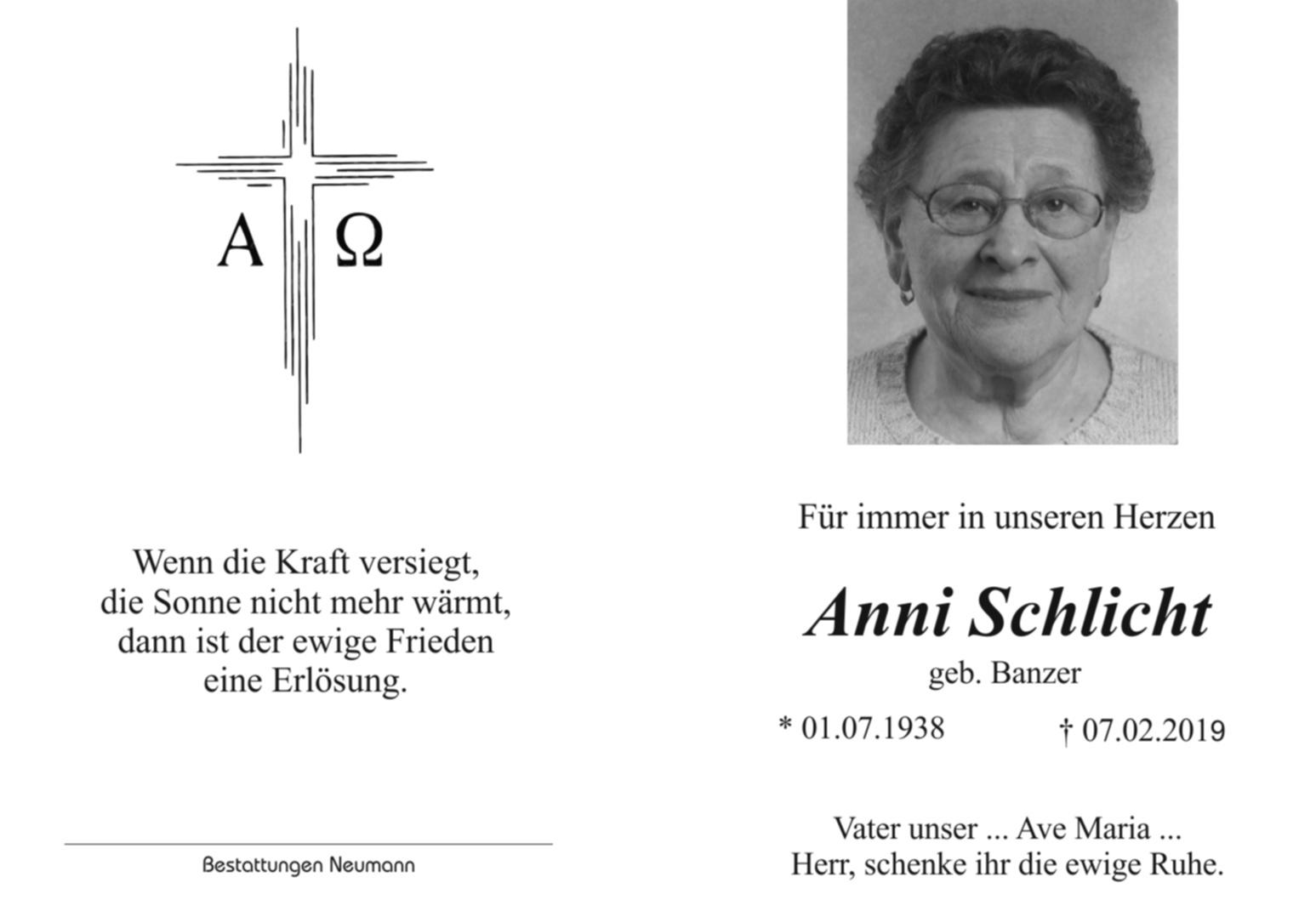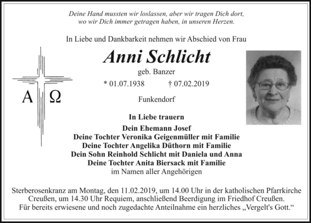 Sterberosenkranz am Montag, den 11.02.2019, um 14.00 Uhr in der katholischen Pfarrkirche Creußen, um 14.30 Requiem, anschließend Beerdigung im Friedhof Creußen. Für bereits erwiesene und noch zugedachte Anteilnahme ein herzliches „Vergelt's Gott.“