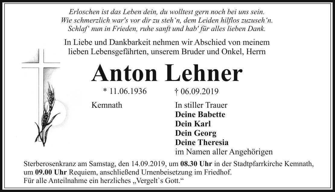 Der Sterberosenkranz findet am Samstag, den 14.09.2019, um 08.30 Uhr in der Stadtpfarrkirche Kemnath statt, um 09.00 Uhr Requiem, anschließend Urnenbeisetzung im Friedhof Kemnath.