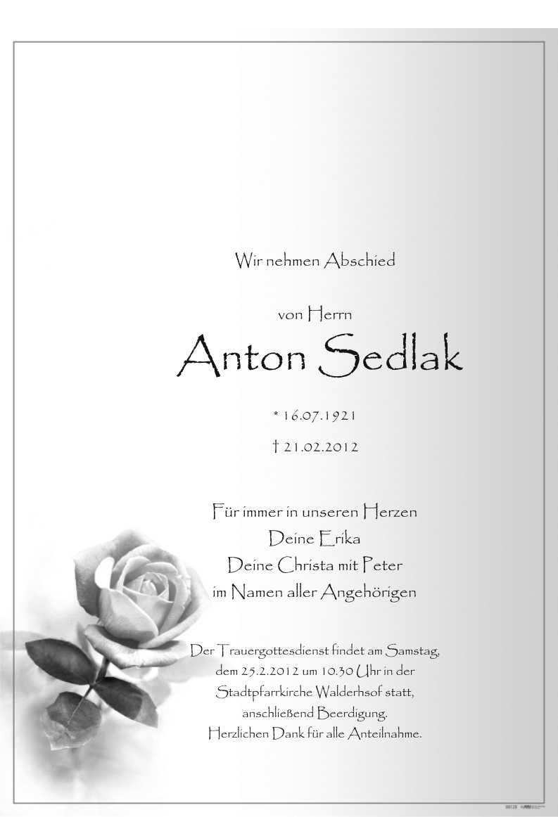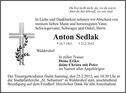 Der Trauergottesdienst findet Samstag, den 25.2.2012, um 10.30 Uhr in der Stadtpfarrkirche „St. Sebastian“ in Waldershof statt, anschließend Beerdigung auf dem Friedhof. Herzlichen Dank für alle Anteilnahme.