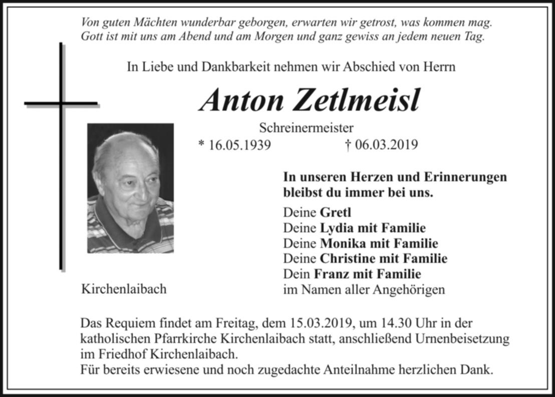Aussegnung, heute, Donnerstag, 07.03.2019, um 18.00 Uhr in Kirchenlaibach, Weidener Str. 3, anschließend um 18.25 Uhr Sterberosenkranz in der katholischen Pfarrkirche. Das Requiem findet am Freitag, den 15.03.2019, um 14.30 Uhr in der katholischen Pfarrkirche in Kirchenlaibach statt, anschließend Urnenbeisetzung. Für bereits erwiesene und zugedachte Anteilnahme herzlichen Dank.