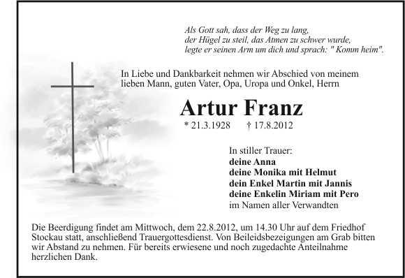 Die Beerdigung findet am Mittwoch, dem 22.8.2012, um 14.30 Uhr auf dem Friedhof Stockau statt, anschließend Trauergottesdienst. Von Beileidsbezeigungen am Grab bitten wir Abstand zu nehmen. Für bereits erwiesene und noch zugedachte Anteilnahme herzlichen Dank.