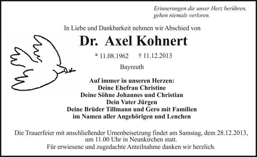 Im Namen des Physikalischen Institutes der Universität Bayreuth möchte ich allen Angehörigen von Herrn Dr. Kohnert unser herzlichstes Beileid für den schweren Verlust aussprechen. Viele Mitglieder der Physik kannten Herrn Kohnert gut und schätzten seine warme menschliche Persönlichkeit im alltäglichen Umgang, wie auch seine konstruktive Arbeit in verschiedenen Universitätsgremien. Wir werden Axel Kohnert ein ehrendes Andenken bewahren.