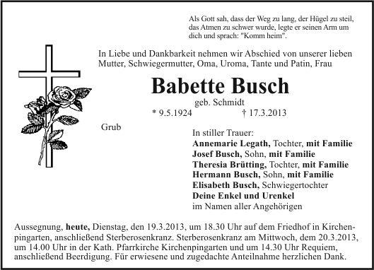 pingarten, anschließend Sterberosenkranz. Sterberosenkranz am Mittwoch, dem 20.3.2013, um 14.00 Uhr in der Kath. Pfarrkirche Kirchenpingarten und um 14.30 Uhr Requiem, anschließend Beerdigung. Für erwiesene und zugedachte Anteilnahme herzlichen Dank.