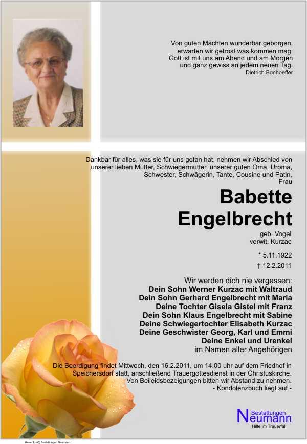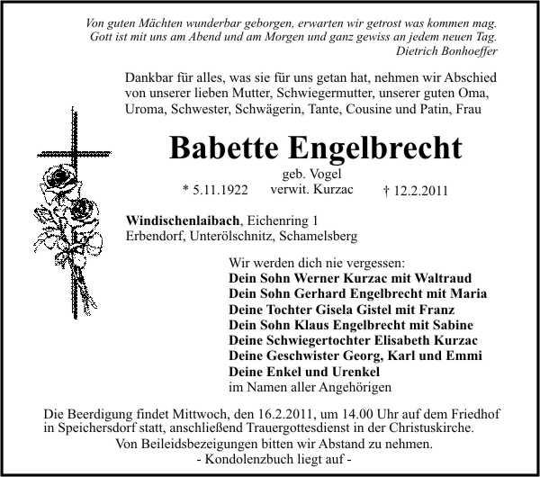 Die Beerdigung findet Mittwoch, den 16.2.2011, um 14.00 Uhr auf dem Friedhof in Speichersdorf statt, anschließend Trauergottesdienst in der Christuskirche.