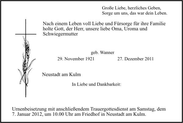 Urnenbeisetzung mit anschließendem Trauergottesdienst am Samstag, dem 7.1.2012, um 10.00 Uhr am Friedhof in Neustadt am Kulm.