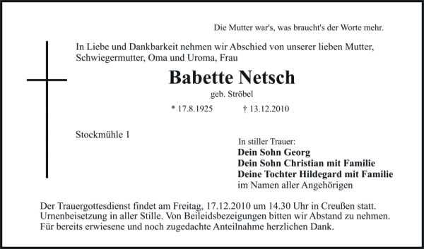 Der Trauergottesdienst findet am Freitag, 17.12.2010 um 14.30 Uhr in Creußen stat. Urnenbeisetzung in aller Stille.