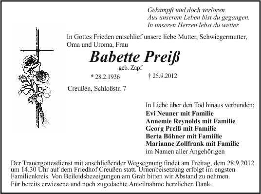 Der Trauergottesdienst mit anschließender Wegsegnung findet am Freitag, dem 28.9.2012 um 14.30 Uhr auf dem Friedhof Creußen statt. Urnenbeisetzung erfolgt im engsten Familienkreis. Von Beileidsbezeigungen am Grab bitten wir Abstand zu nehmen. Für bereits erwiesen4e und noch zugedachte Anteilnahme herzlichen Dank.