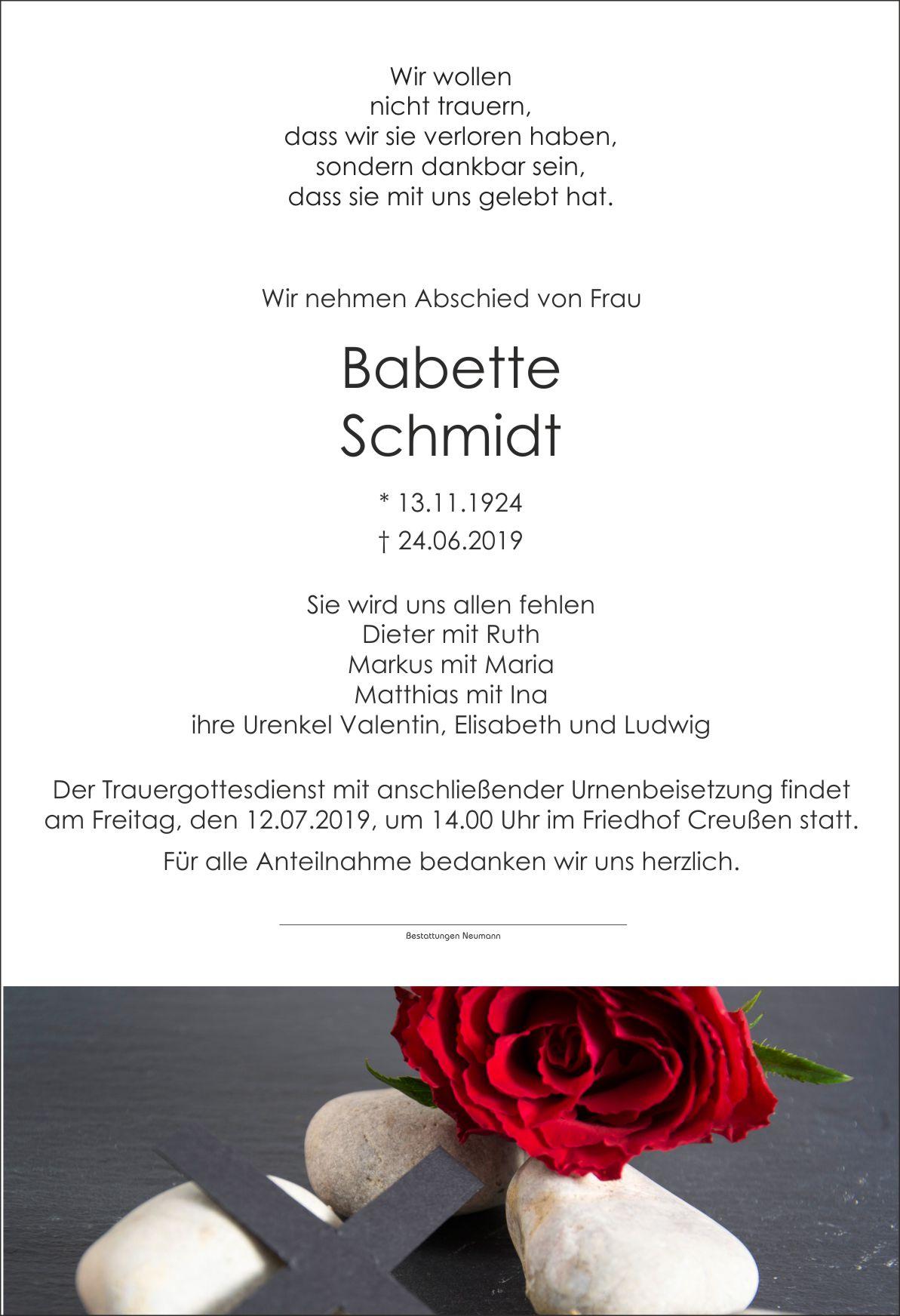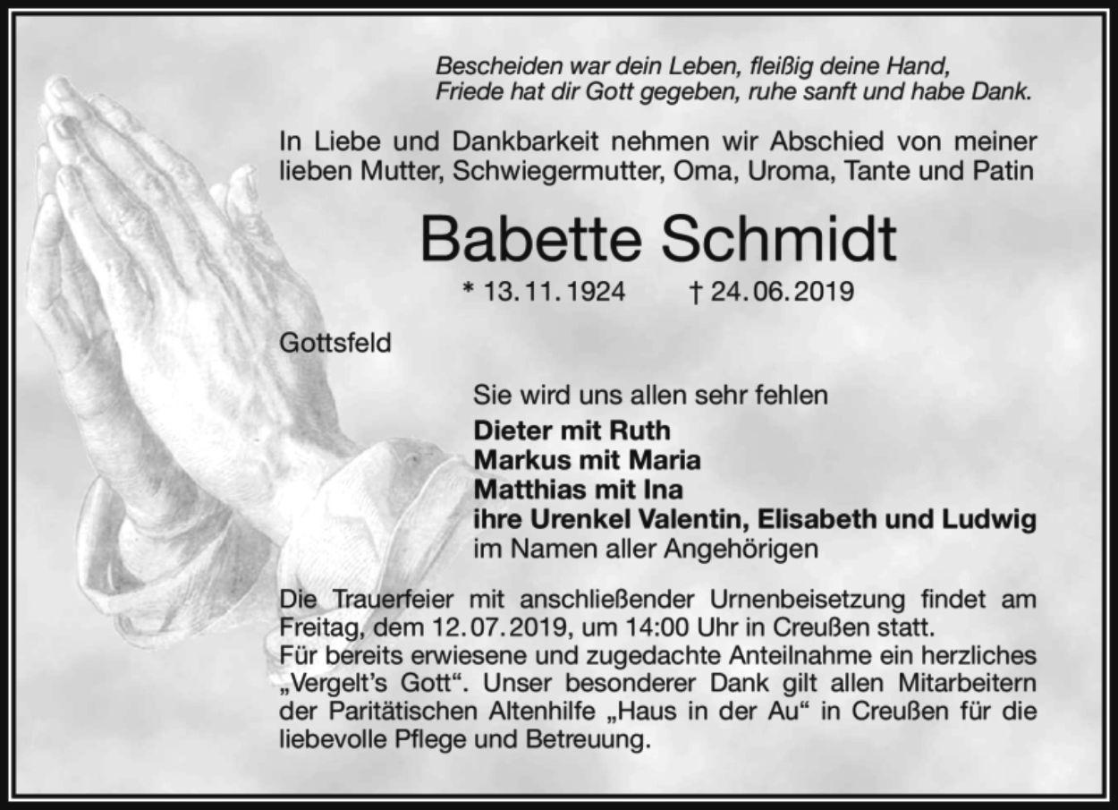 Der Trauergottesdienst mit anschließender Urnenbeisetzung findet am Freitag, den 12.07.2019, um 14.00 Uhr im Friedhof Creußen statt.