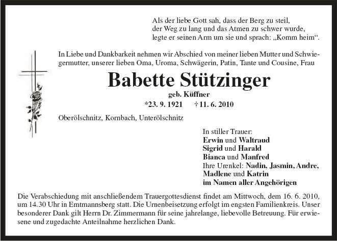 Die Verabschiedung mit anschließendem Trauergottesdienst findet Mittwoch, den 16.6.2010, um 14.30 Uhr in Emtmannsberg statt. Die Urnenbeisetzung erfolgt im engsten Familienkreis.