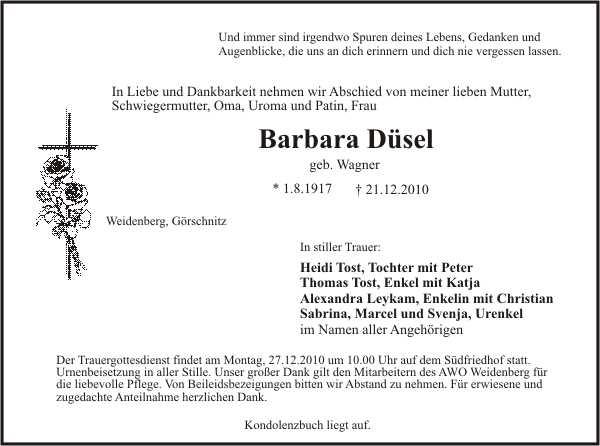 Der Trauergottesdienst findet am Montag, 27.12.2010 um 10.00 Uhr im Südfriedhof Bayreuth statt, Urnenbeisetzung in aller Stille.