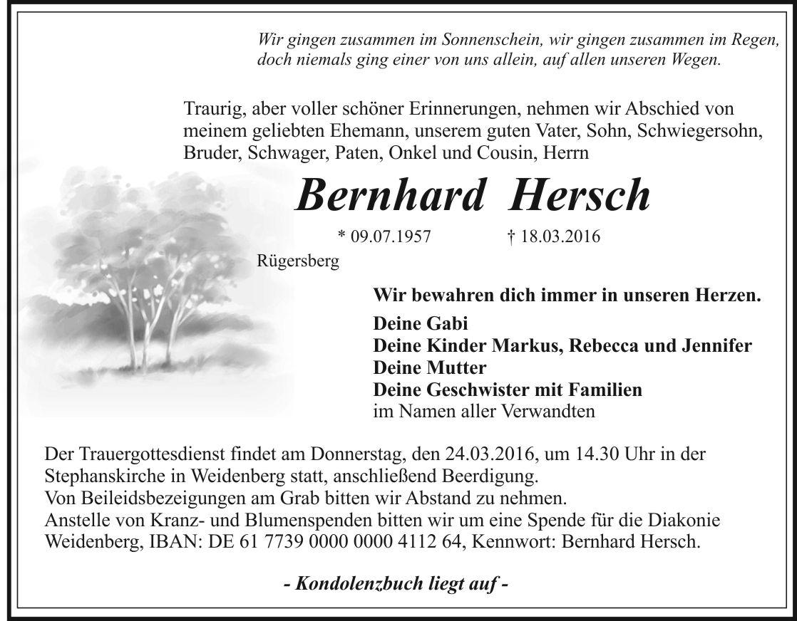 Anstelle von Kranz- und Blumenspenden bitten wir um eine Spende für die Diakonie Weidenberg, IBAN: DE 61 7739 0000 0000 4112 64, Kennwort: Bernhard Hersch.