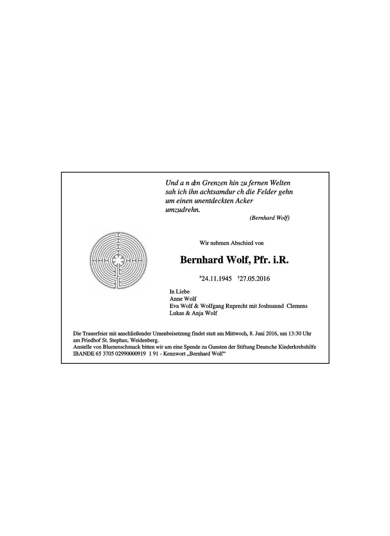 Die Trauerfeier mit anschließender Urnenbeisetzung findet statt am Mittwoch, 8. Juni 2016, um 13.30 Uhr am Friedhof St. Stephan, Weidenberg.