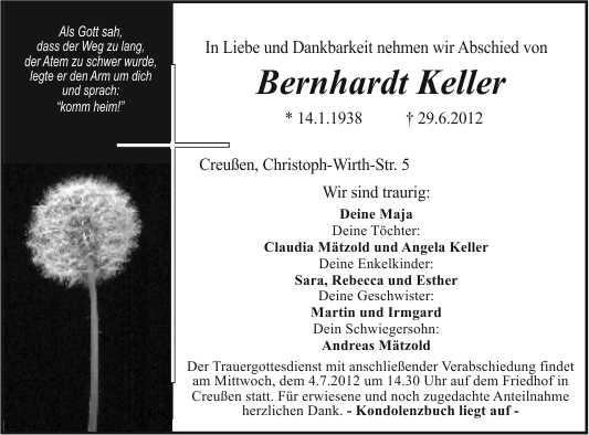 Der Trauergottesdienst mit anschließender Verabschiedung findet am Mittwoch, dem 4.7.2012 um 14.30 Uhr auf dem Friedhof in Creußen statt. Für erwiesene und noch zugedachte Anteilnahme herzlichen Dank. - Kondolenzbuch liegt auf -