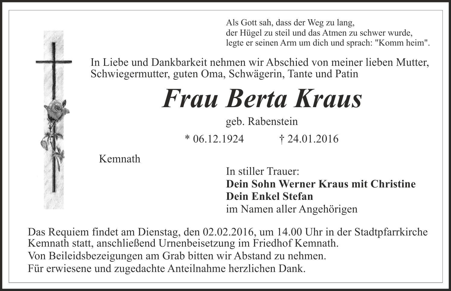 Requiem am Dienstag, den 02.02.2016, um 14.00 Uhr in der Stadtpfarrkirche Kemnath, anschließend Urnenbeisetzung im Friedhof Kemnath. Von Beileidsbezeigungen am Grab bitten wir Abstand zu nehmen. Für erwiesene und noch zugedachte Anteilnahme herzlichen Dank.