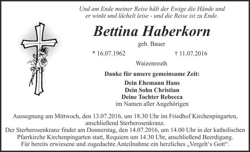 Die Aussegnung findet am Mittwoch, den 13.07.2016, um 18.30 Uhr im Friedhof Kirchenpingarten statt, anschließend Sterberosenkranz.
