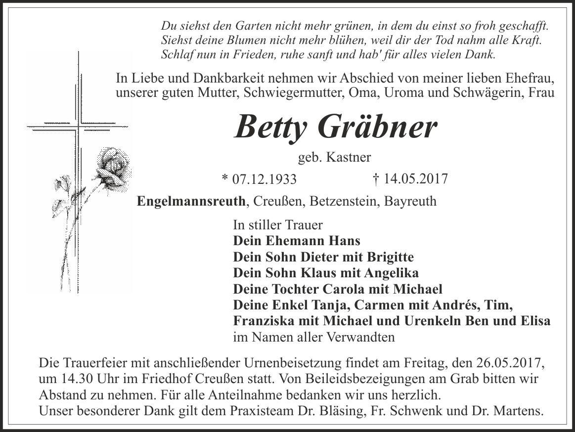 Die Trauerfeier mit anschließender Urnenbeisetzung findet am Freitag, den 26.05.2017, um 14.30 Uhr im Friedhof Creußen statt. Für alle Anteilnahme bedanken wir uns herzlich.