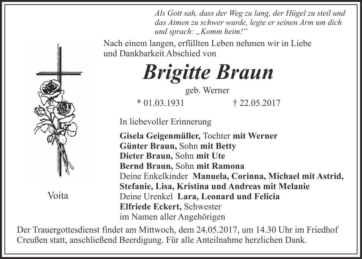 Der Trauergottesdienst findet am Mittwoch, den 24.05.2017, um 14.30 Uhr im Friedhof Creußen statt, anschließend Beerdigung. Für alle Anteilnahme herzlichen Dank.