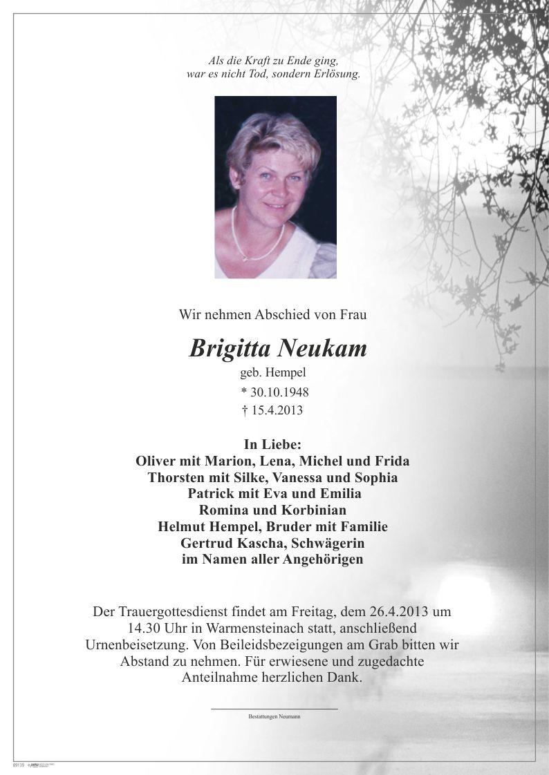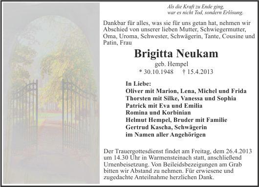 Dere Trauergottesdienst mit anschließender Urnenbeisetzung findet am Freitag, dem 26.4.2013 um 14.30 Uhr auf dem Friedhof Warmensteinach statt. Für alle Anteilnahme herzlichen Dank.