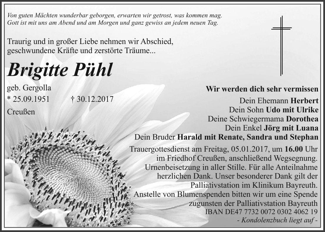 Trauergottesdienst am Freitag, 05.01.2017, um 16.00 Uhr im Friedhof Creußen, anschließend Wegsegnung. Urnenbeisetzung in aller Stille. Für alle Anteilnahme herzlichen Dank. Unser besonderer Dank gilt der Palliativstation im Klinikum Bayreuth.