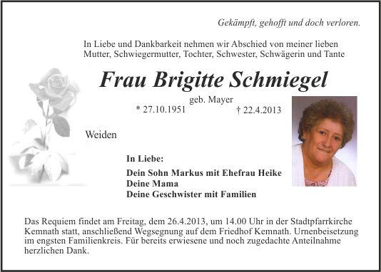 Das Requiem findet am Freitag, dem 26.4.2013, um 14.00 Uhr in der Stadtpfarrkirche Kemnath statt, anschließend Wegsegnung auf dem Friedhof Kemnath. Urnenbeisetzung im engsten Familienkreis. Für bereits erwiesene und noch zugedachte Anteilnahme herzlichen Dank.
