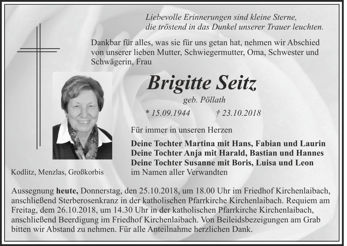 Aussegnung am Donnerstag, dem 25.10.2018, um 18.00 Uhr im Friedhof Kirchenlaibach, anschließend Sterberosenkranz in der katholischen Pfarrkirche Kirchenlaibach. Requiem am Freitag, dem 26.10.2018, um 14.30 Uhr in der katholischen Pfarrkirche Kirchenlaibach, anschließend Beerdigung im Friedhof Kirchenlaibach. Von Beileidsbezeigungen am Grab bitten wir Abstand zu nehmen. Für alle Anteilnahme herzlichen Dank.
