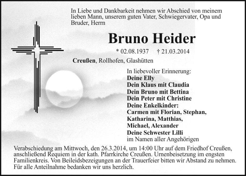 Verabschiedung am Mittwoch, den 26.3.2014, um 14:00 Uhr auf dem Friedhof Creußen, anschließend Requiem in der kath. Pfarrkirche Creußen. Urnenbeisetzung im engsten Familienkreis. Von Beileidsbezeigungen an der Trauerfeier bitten wir Abstand zu nehmen. Für alle Anteilnahme bedanken wir uns herzlich.