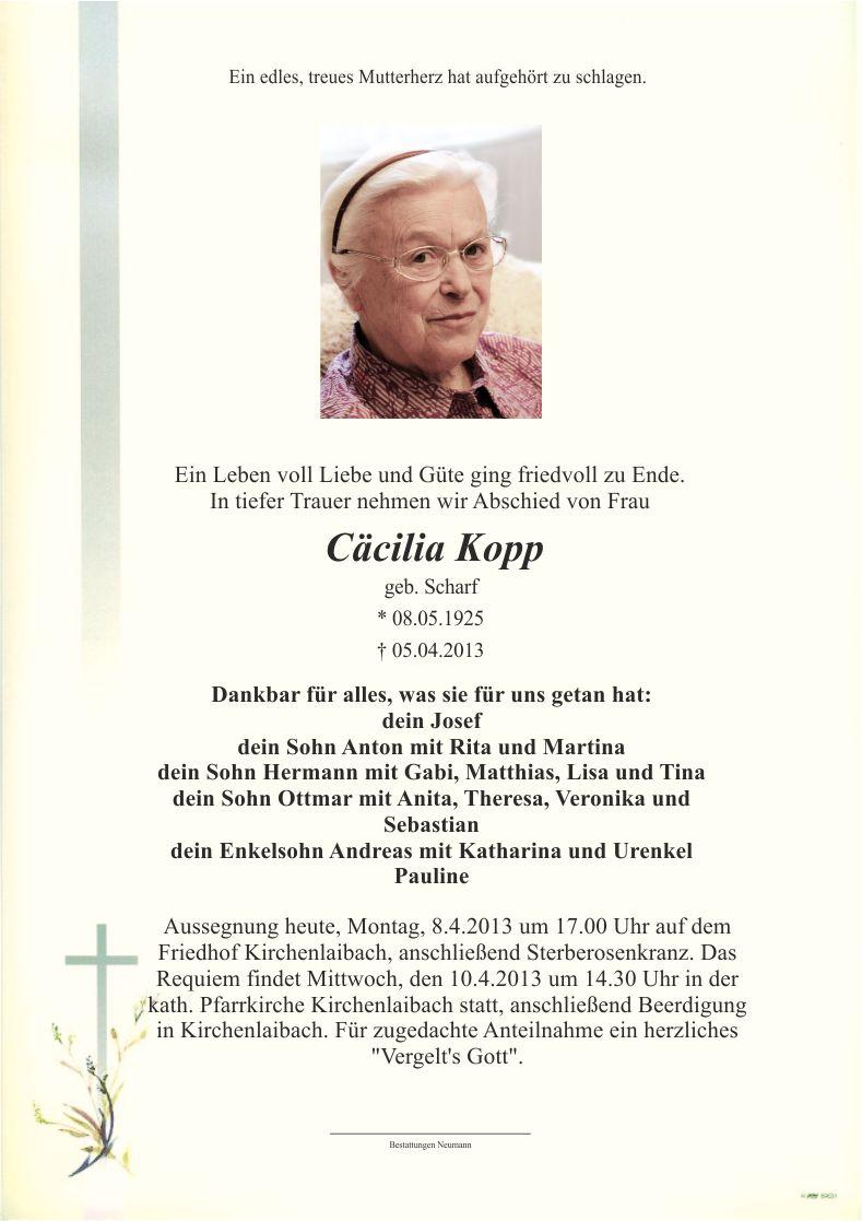 Aussegnung heute, Montag, 8.4.2013 um 17.00 Uhr auf dem Friedhof Kirchenlaibach, anschließend Sterberosenkranz. Das Requiem findet Mittwoch, den 10.4.2013 um 14.30 Uhr in der kath. Pfarrkirche Kirchenlaibach statt, anschließend Beerdigung in Kirchenlaibach. Für zugedachte Anteilnahme ein herzliches "Vergelt's Gott".