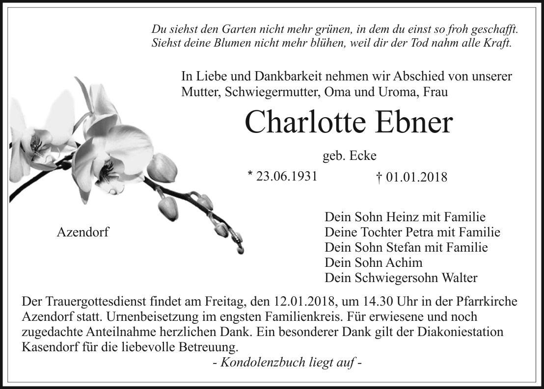Der Trauergottesdienst findet am Freitag, den 12.01.2018, um 14.30 Uhr in der Pfarrkirche Azendorf statt. Urnenbeisetzung im engsten Familienkreis. Für erwiesene und noch zugedachte Anteilnahme herzlichen Dank. Ein besonderer Dank gilt der Diakoniestation Kasendorf für die liebevolle Betreuung.