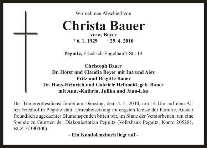 Der Trauergottesdienst findet am Dienstag, 4.5.2010 um 14.00 Uhr auf dem alten Friedhof in Pegnitz statt.