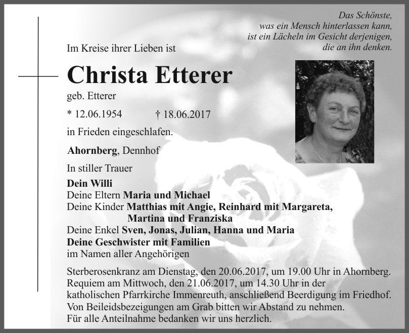 Aussegnung am Montag, den 19.06.2017, um 18.00 Uhr im Friedhof Immenreuth, anschließend Sterberosenkranz in Ahornberg. Sterberosenkranz am Dienstag, den 20.06.2017, um 19.00 Uhr in Ahornberg. Requiem am Mittwoch, den 21.06.2017, um 14.30 Uhr in der katholischen Pfarrkirche Immenreuth, anschließend Beerdigung im Friedhof. Für alle Anteilnahme herzlichen Dank.