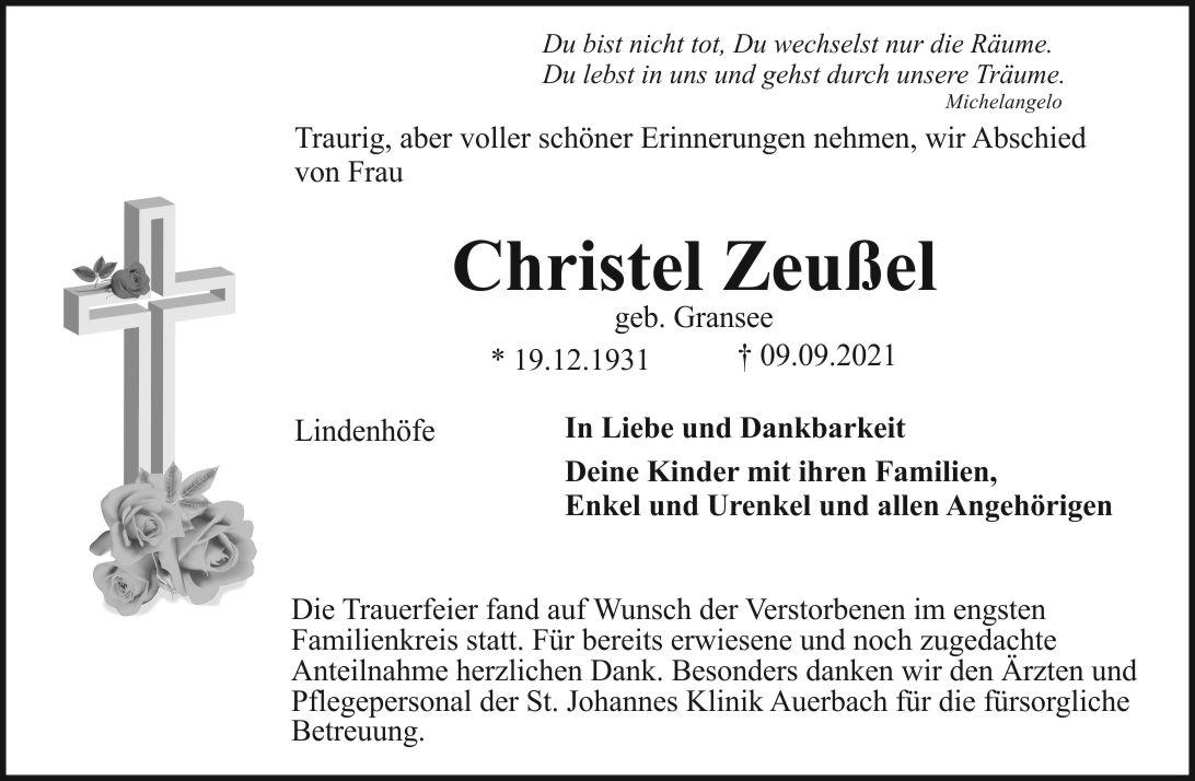 Die Trauerfeier fand auf Wunsch der Verstorbenen im engsten Familienkreis statt. Für bereits erwiesene und noch zugedachte Anteilnahme herzlichen Dank. Besonders danken wir den Ärzten und Pflegepersonal der St. Johannes Klinik Auerbach für die fürsorgliche Betreuung.