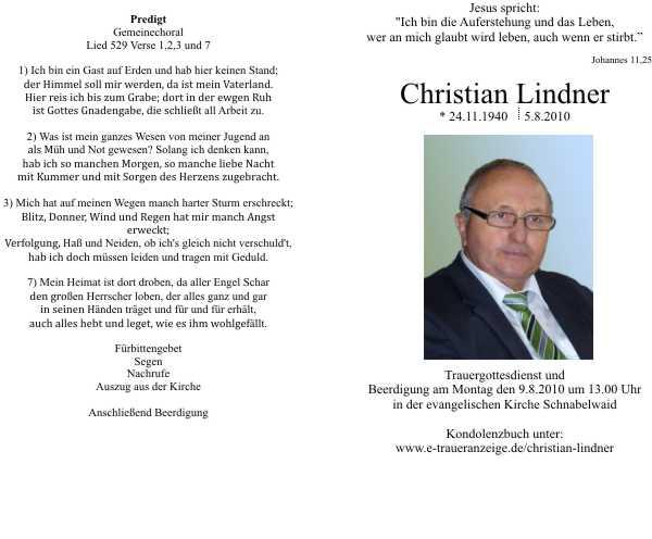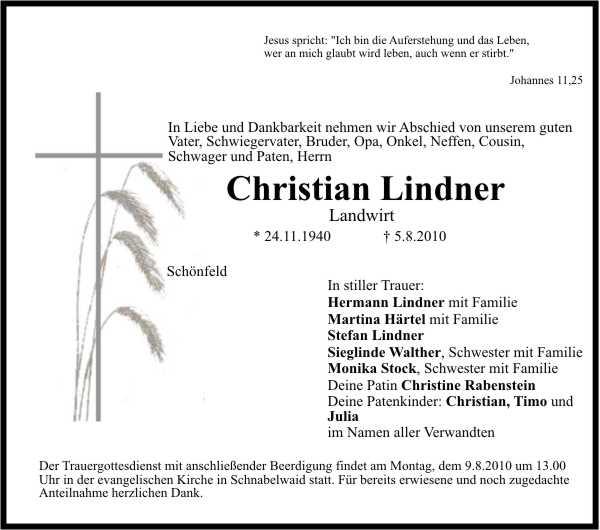 Der Trauergottesdienst findet am Montag dem 9.8.2010 um 13.00 Uhr in der evangelischen Kirche in Schnabelwaid statt, anschließend Beerdigung.