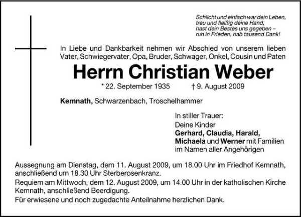Aussegnung am Dienstag 11.8.2009 um 18.00 Uhr im Friedhof Kemnath, anschließend um 18.30 Uhr Sterberosenkranz. Requiem am Mittwoch 12.8.2009 um 14.00 Uhr in der katholischen Kirche in Kemnath, anschließend Beerdigung.